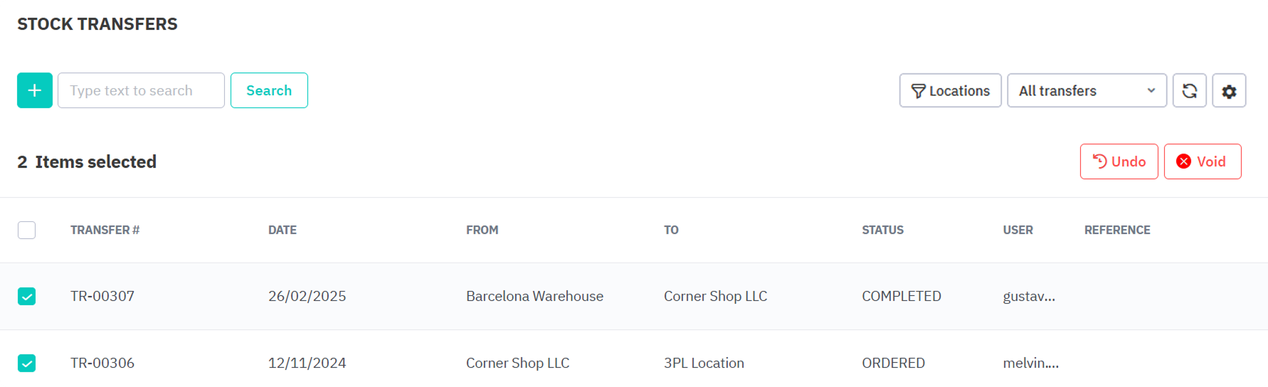 Check the boxes next to the transfer orders you want to undo or void.