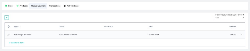 Once the stock transfer is completed, you can allocate transfer-related costs to transferred stock or as a business expense using the Manual Journals tab. You can distribute costs to stock transfer items by cost, quantity, volume, weight, or manually.