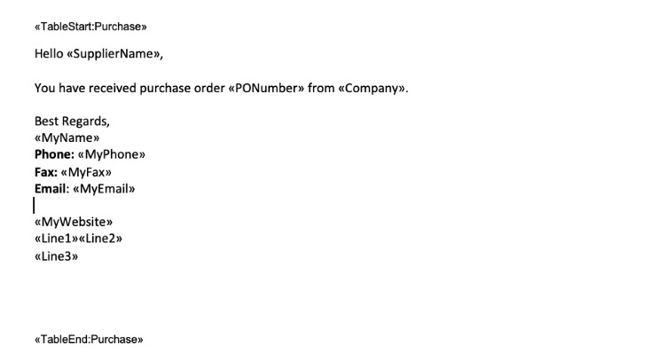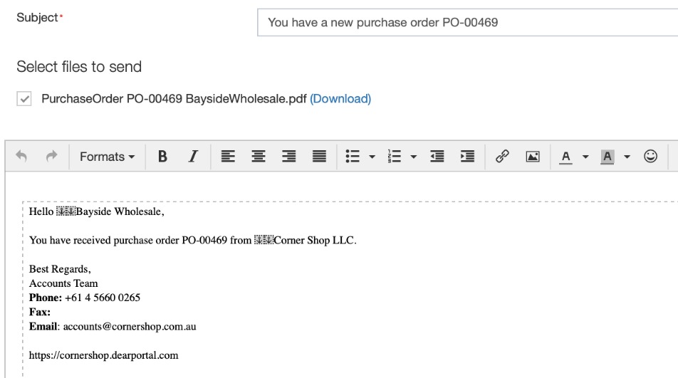 Now when emailing a purchase order to a supplier, your new email template will be applied: