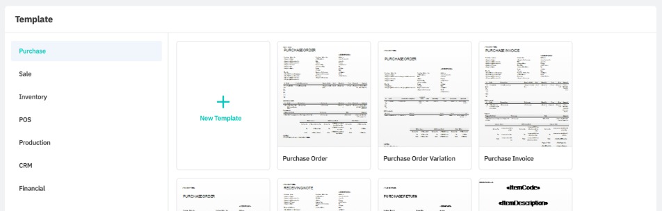 Templates are divided by section (purchase, sale, inventory, POS, etc.). Within each section you can see default templates for each document type (purchase order, purchase invoice, etc.) within that section.
