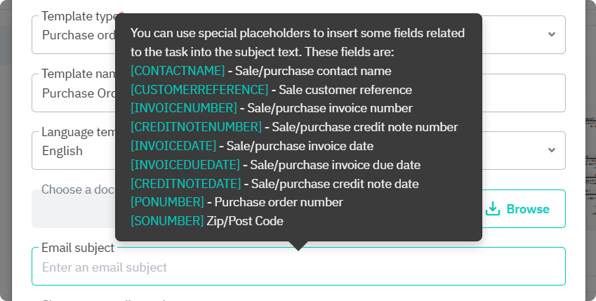 Save your changes. You can now select your new template when printing or emailing that document type (for example, purchase invoices from the invoice tab of a purchase order).