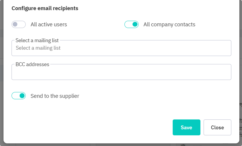 Send to the supplier: Sends email to the supplier for the purchase order. By default, this is enabled (only available for purchase documents).