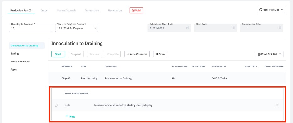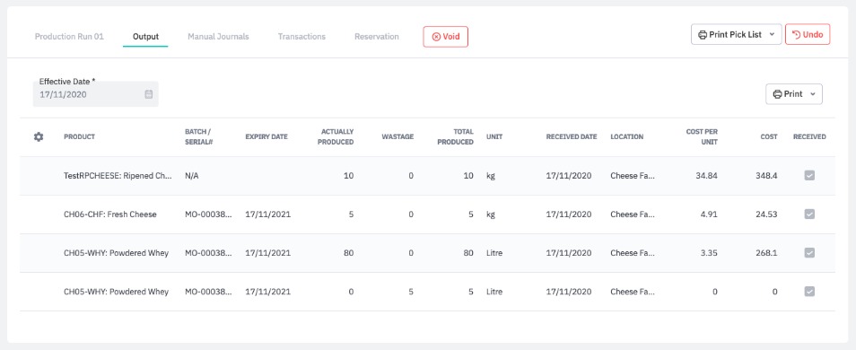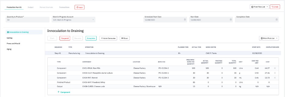 If it is the final operation, or the operation produces a finished product or output, the user will be prompted to input the actual output and wastage quantity, if any. If final consumed component quantities/costs differ from consumed quantities when starting the production run, accounting transactions are updated to reflect this.
