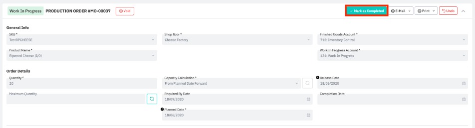 Completing the production order auto-fills the completion date and time, this cannot be edited after completion.