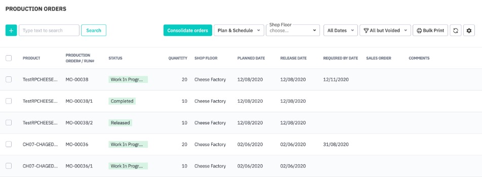 The production orders list is accessed from Production → Production Orders. The list screen allows you to create new orders, consolidate orders, plan and release orders directly. See Production Orders List for more information.