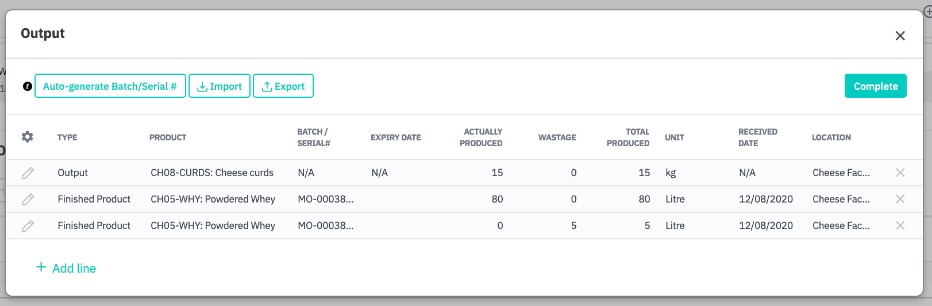 You can Auto-generate Batch/Serial # for your finished products with batch/serial # costing methods, or import them via CSV file with Output/Wastage details.