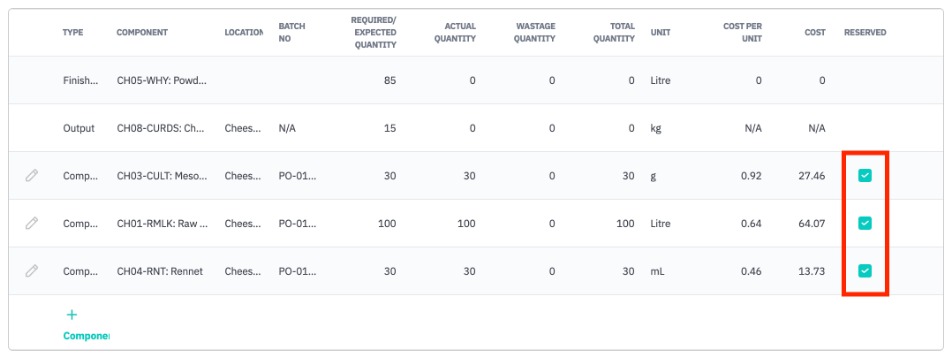 Component reservation is executed on the Production Run operation level manually before the production process starts, i.e. before Start button is pressed for the operation, but after Auto-consume button is pressed to populate the components and their locations to the components grid in the operation. Check the checkbox in the Reserved column of the components grid to reserve component.