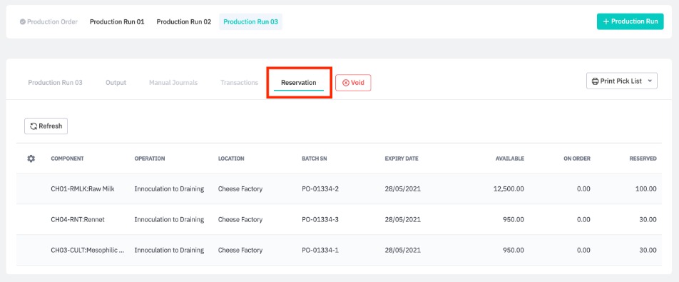 View reserved components for a production run from the Reservation tab.