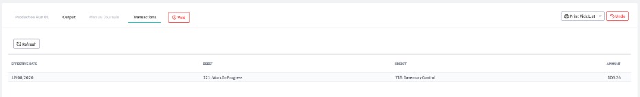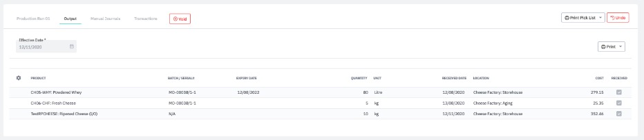 When all operations in a production run are completed, Enter the Completion Date and click Complete (WIP is credited, Finished Goods is debited, Wastage is posted to expense account if applicable). Cost is calculated and allocated to the finished products upon Complete.