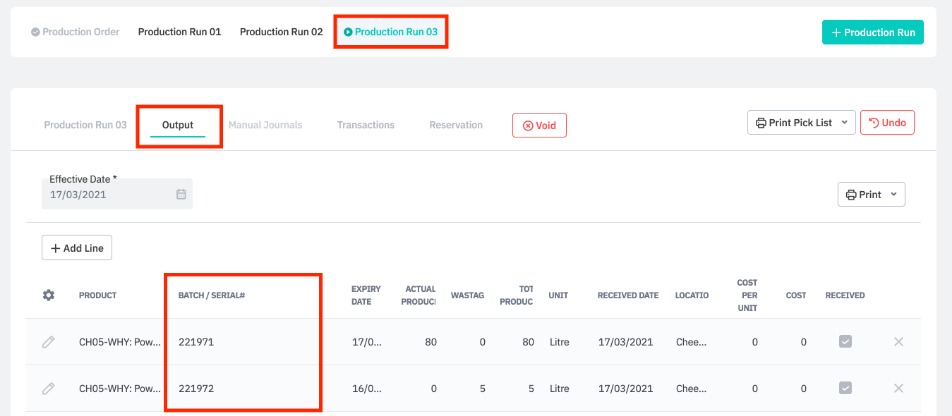 Note: Finished products wastage for batch/serial# products should have its own line with a separate batch/serial #.