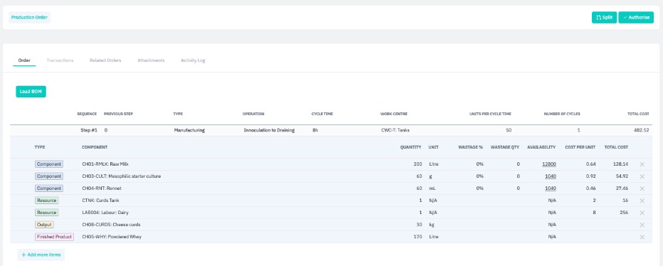 At this stage, you can also choose to split the production order by clicking Split before Authorize. This opens a dialogue box where you choose how many units of the finished good to produce in each order. Click Split on the dialogue box to split the order.