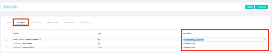 Default Delivery To location is set from a product's Production BOM. The default location for a finished product can be overwritten from a Production Order. Click the Delivery To tab of a Draft or Planned production order. Delivery location cannot be edited once a production order has been released.