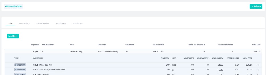 The next step is to specify the components for the production order. Upon clicking the Load Production BOM button, the Production Order tab displays the Production BOM set up for the finished good to be produced in Cin7 Core.