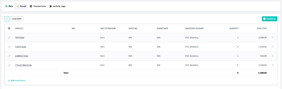 In the Result tab, click Load BOM to see the component products produced from the disassembly and their costs. The Quantity, Work in Progress account, Costs and Labour & Overheads can all be manually adjusted if the final value differs from the BOM value.