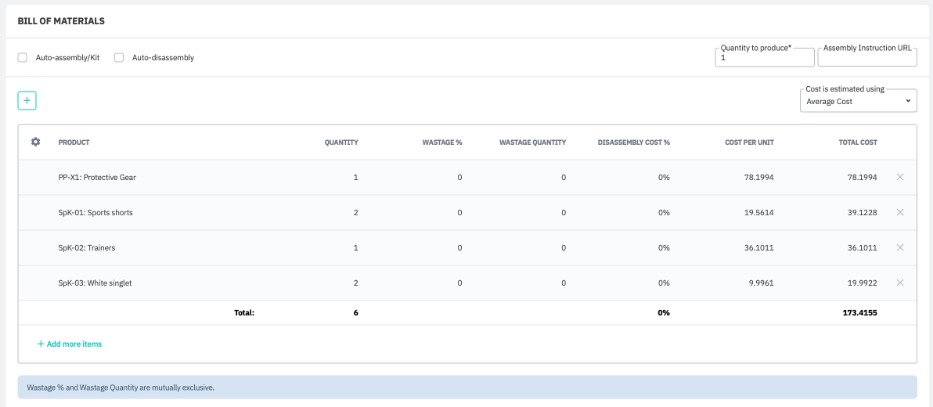 This activates the Bill of Materials tab below. Use + or Add more items to select the component products from your inventory.