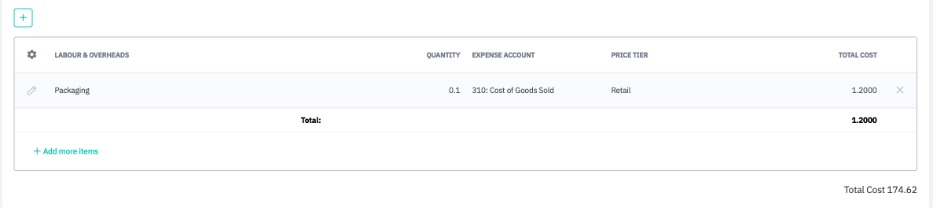 Service items associated with the disassembly can be included by clicking + or Add more items to the Labour and Overheads section. It is required to include an Expense Account.