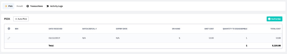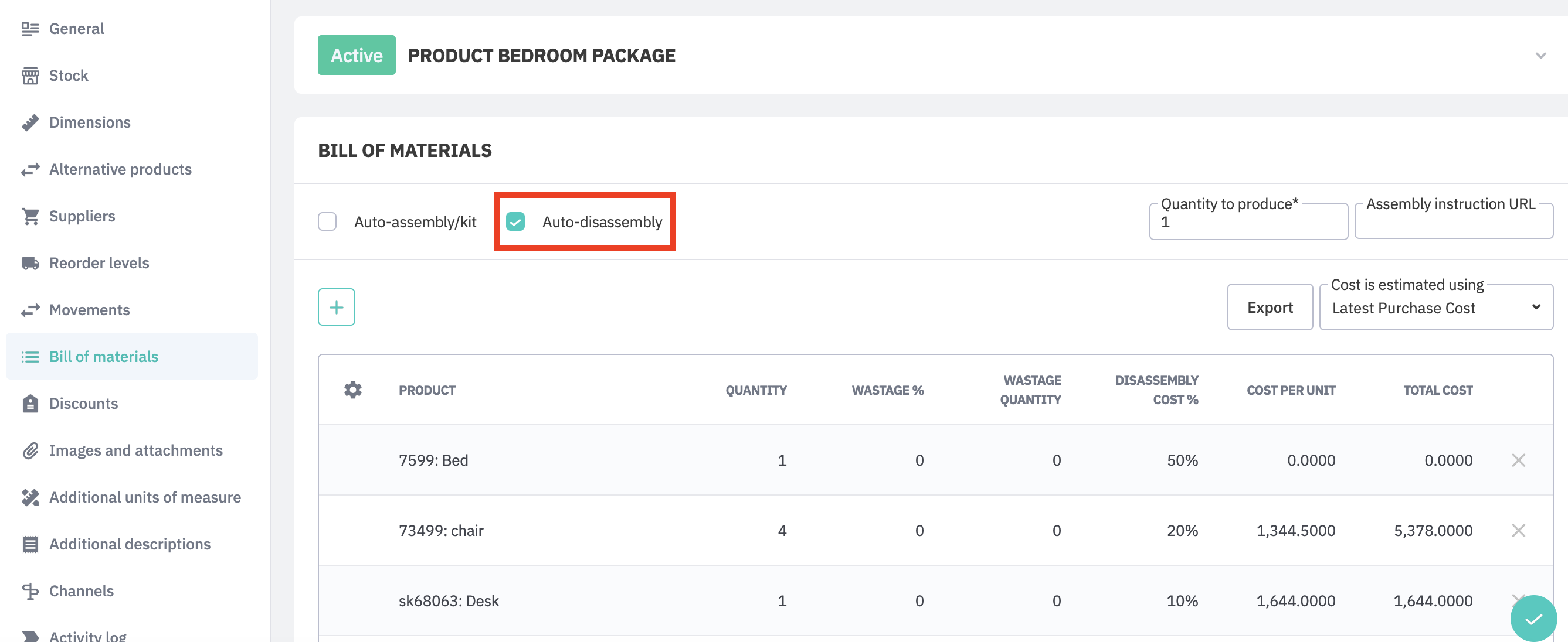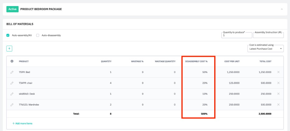 Note: The BOM is for your reference only. The actual cost of disassembled products will be calculated using the actual cost of the assembly picked according to its costing method (FIFO, FEFO, etc.) and the Disassembly Cost % specified in the BOM. Actual costs can vary from the estimated 'Total' cost displayed in the BOM.