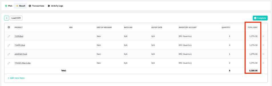 Note: Sometimes, splitting components can cause a small rounding error, meaning the total cost of the disassembled product does not quite match the cost of products created via disassembly. This will cause an error and not allow the disassembly to complete. The Total Cost field is editable for components in the Result tab; it should be amended so that the summary matches the total cost from Pick.