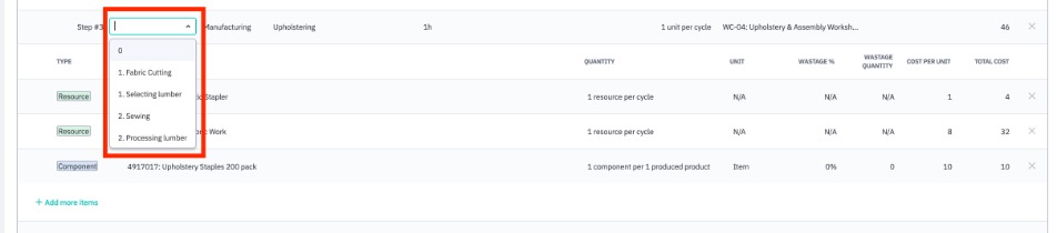 Parallel sequences in a Production BOM can be set up by adding the previous operation name in the Previous step column dropdown field. Selecting Step 0 here indicates that no previous operations must be completed before the operation can begin.