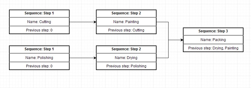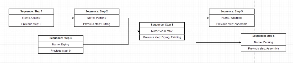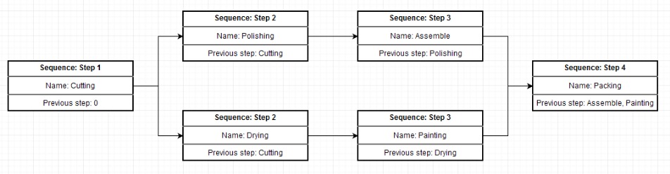 Packing (Step 4) operation requires previous both operations Assemble (Step 3) and Painting (Step 3) to be completed.