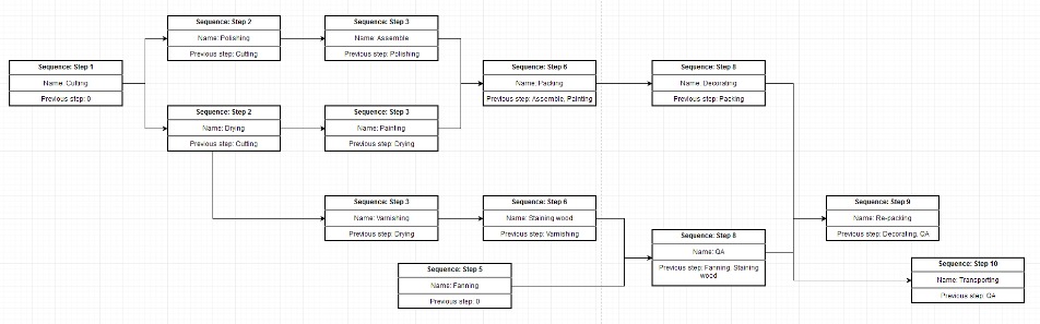 Packing (Step 6) and Staining Wood (Step 6) operation require all three Step 3 operations to be completed. Both Step 6 operations will be started simultaneously.