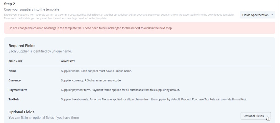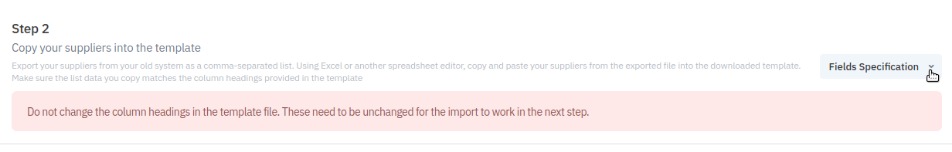 For example, to view the Supplier CSV template's specifications, click Purchases → Suppliers, then on the Suppliers page, click Import → Suppliers. You can then click the Field Specifications button to view the format, which is hidden by default.