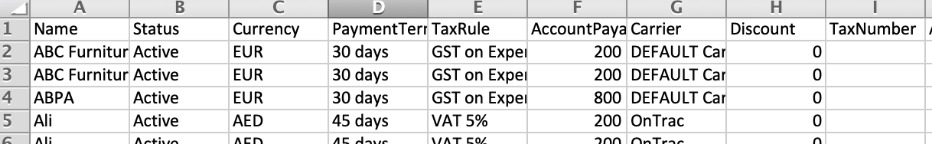 Copy your supplier addresses into the template. Make sure the information matches the column headings, which must not be changed for the import to work.
