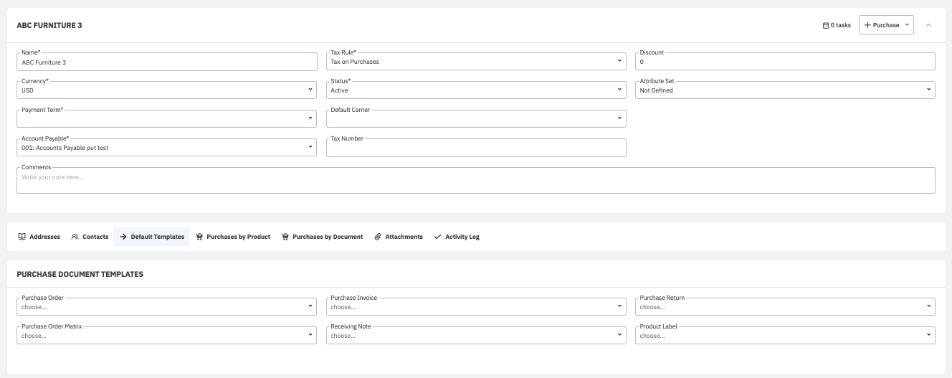 The Default Templates tab allows you to select the default document and email templates to be used for this supplier's purchase documents (e.g. purchase invoice, purchase, etc.) Select templates from the dropdown field and Save your changes. Only one template can be set as default for each purchase document.