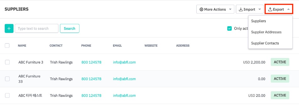 Export your supplier list by navigating to Purchases → Suppliers and clicking Export → Suppliers.