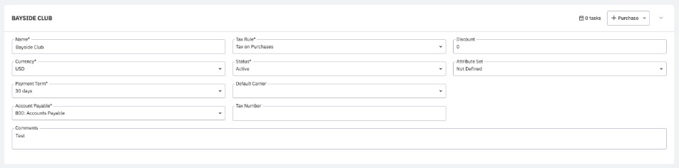 New suppliers can be created by navigating to Purchases → New → Supplier or Purchases → Suppliersand clicking +.