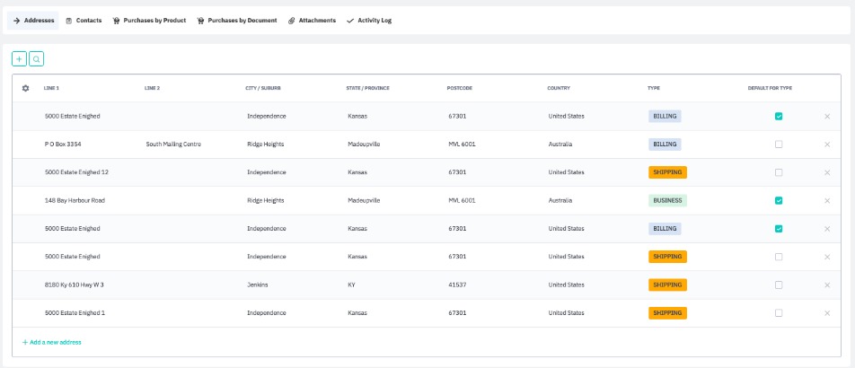 Once general information has been provided for a supplier, addresses can be added. Multiple addresses can be added for the same supplier. Each type of address (Business, Shipping, Billing) must be correctly identified for each supplier so that this information is correctly displayed on invoices, purchase orders or any other Cin7 Core document.