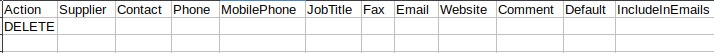 Note: To delete records from your supplier contacts, enter Delete under the Action column of the CSV file. If this field is left blank, the record will either be created (if it is not in the Supplier list) or updated (if it is already in the Supplier list).Multiple contacts can be added for the same supplier by adding new address lines with the same supplier name.