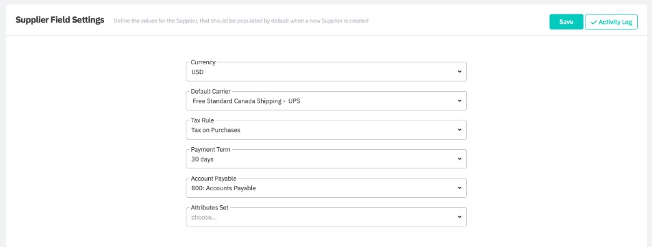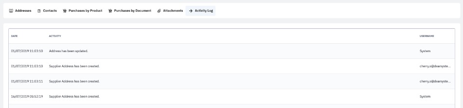 The Activity Log shows any changes that users or the system have made to the Supplier record, including a date/time stamp.