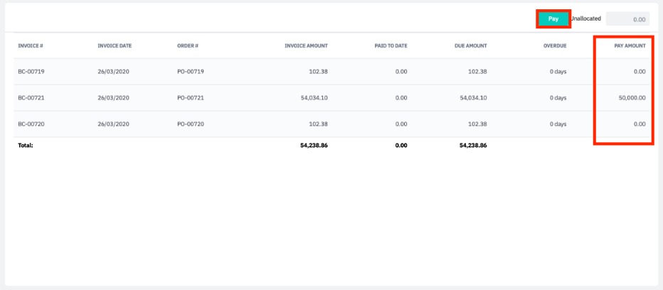 Enter the Amount to be paid to the supplier. The total outstanding amount is shown at the bottom of the table of outstanding invoices. The remaining unallocated payment is shown to the top right of the table.