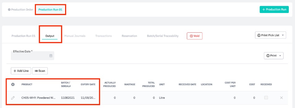 Next, go to the Output tab of the production run and add a finished product, entering a serial/batch number and expiry date if applicable. This is possible at any point after a production order is released and a production run is created. This will add the product to the Batch/serial traceability tab.