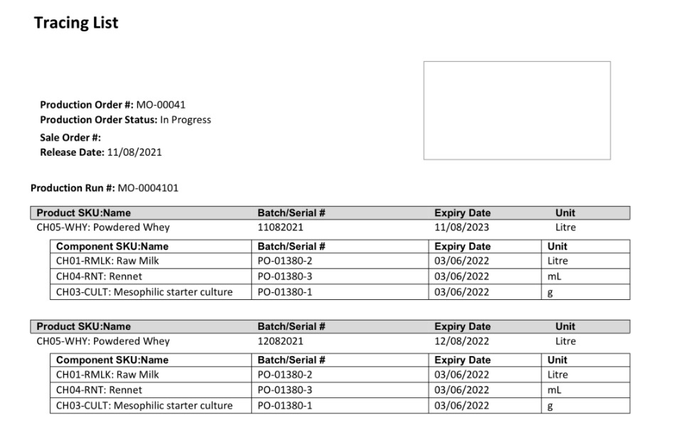 The Batch/Lot Recall function also shows which finished products a product has been used in, but also shows the suppliers, customers, and stock on hand of that batch, and can prepare recall letters for your customers.