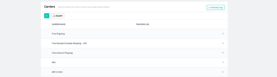 List carriers you will be using to transport your goods. You can select from these carriers in the Ship tab of the sales process. If known, enter their tracking URLs as well, which serve the following purposes: