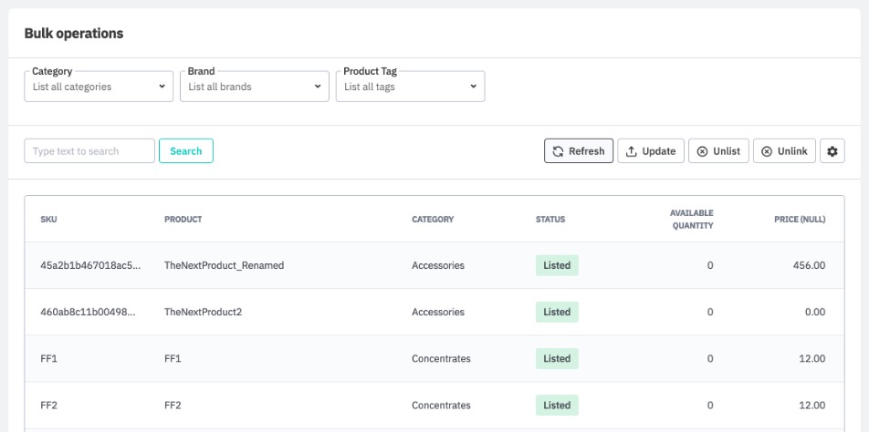 Select products to update, unlist, or unlink in bulk. You can select products by brand, category, product tag.