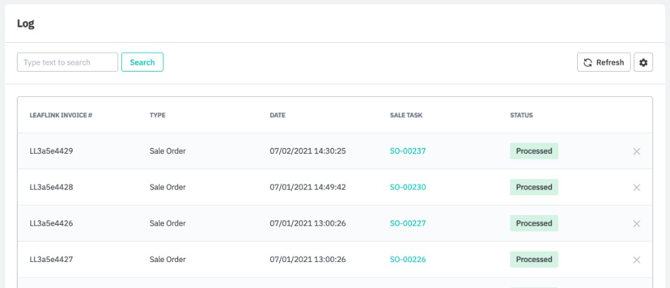 Each captured LeafLink order, once saved to Pending Sales, creates a Log entry to enable tracking of the linked sale in Cin7 Core and in LeafLink. This also helps avoid creating duplicate orders when capturing the same order several times during manual order load.