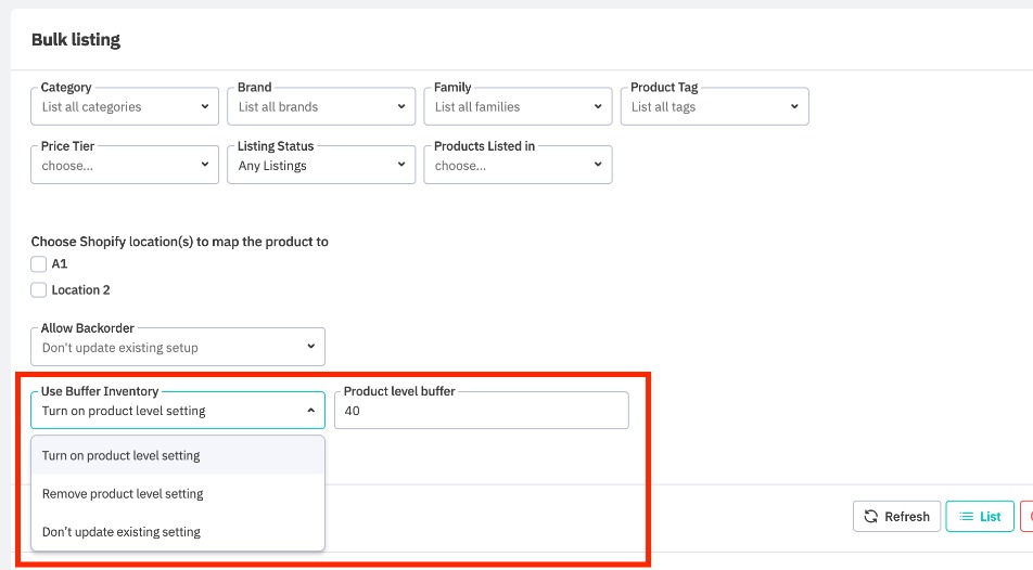 Buffer Inventory for the whole channel can be overwritten by a product level buffer from either the Catalog or Bulk listing page (Use buffer inventory must be enabled from the channel Setup tab). The product level buffer value will ALWAYS override the value set on the setup tab. If the setup tab buffer inventory value is changed, this will not affect products with product level buffers.