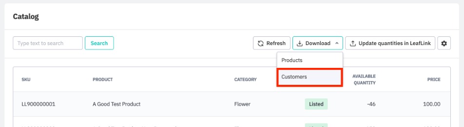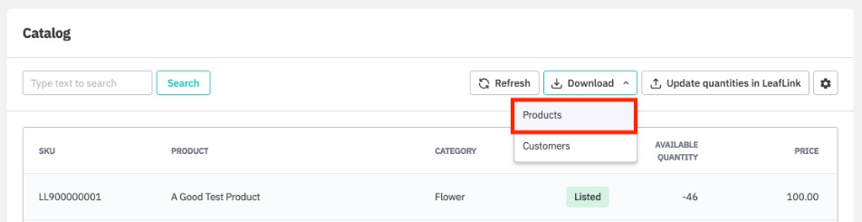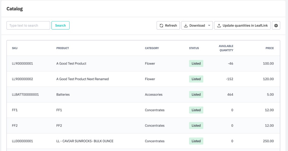 Due to legal restrictions, products can only be created in LeafLink. Products can be updated, unlinked (breaks link without removing product from LeafLink) or unlisted (sets LeafLink product to Archived) from this tab. Press Refresh to update the display.
