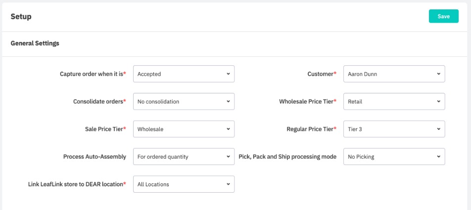 Once you've connected Cin7 Core to your LeafLink account, you can then configure the integration settings between the two systems under the Setup tab on the LeafLink Integration page in Cin7 Core.