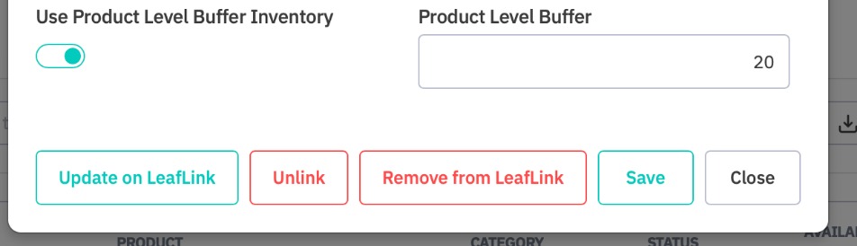 Buffer inventory: Displayed when Use buffer inventory is enabled. Enter an integer number of stock to act as a buffer. Sync quantity passed to LeafLink when updating stock levels will be equal to Actual stock - buffer inventory.
