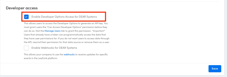 API key: Secure API authorization key generated for account in LeafLink management interface