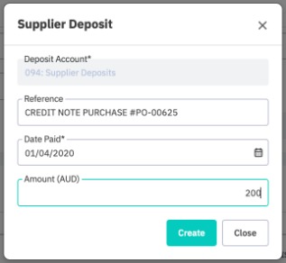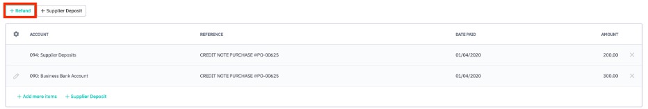 Return some or all of the value of the credit note to a supplier deposit by clicking +Supplier Deposit.