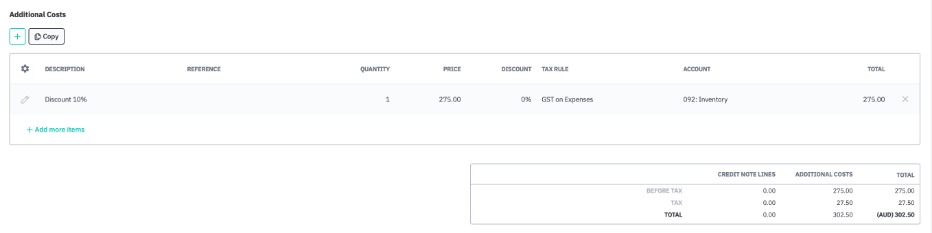Add the incorrectly received or returned items to the credit note by clicking + or +Add more items. You can also click Copy to add all of the order lines from the shipment, then delete the correctly received lines.
