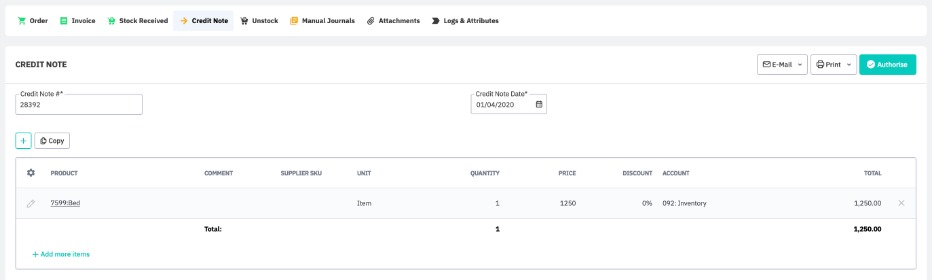 Note:Doing unstock will result in negative stock on hand. Thus, lines can only be unstocked if the products have not been used yet. If the stock has been transferred or some other transaction involving the stock has been performed, unstock may fail. In this case, the credit note can be authorized without an unstock and inventory adjustment can be processed to offset stock level.