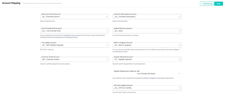 The accounts needed for Cin7 Core to function correctly are listed below with their required settings.