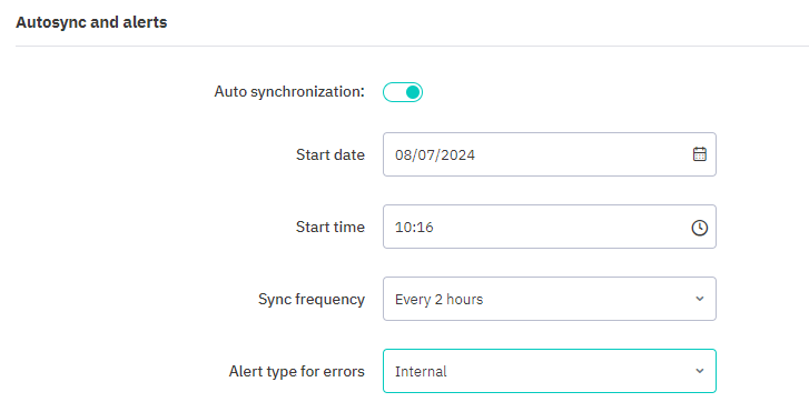 You can choose to sync Cin7 Core systems with QuickBooks manually or automatically. Toggle auto synchronization to Yes to display additional autosync options. You can set the start date, start time, sync frequency, and the alert type for any errors raised during the synchronization process.