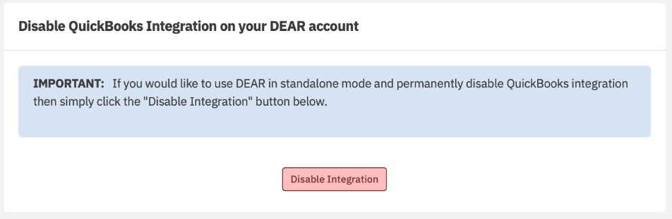 If you decide that you want to remove the integration between Cin7 Core and QuickBooks Online permanently, click the Disable Integration button in Advanced settings. You can continue to use Cin7 Core as a standalone accounting system.